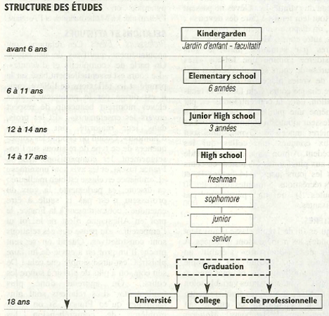La très grande majorité des élèves américains entre donc vers 4 ou 5 ans à l’école et en ressort “graduée” à l’âge de 17-18 ans : la plupart des élèves ont donc suivi à peu près le même parcours.