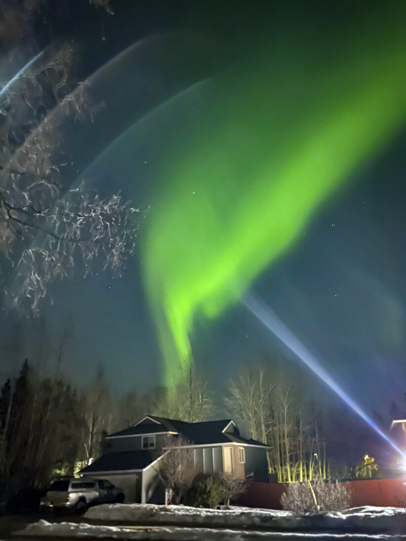 TOUT PEUT ARRIVER — Cette photo a été prise quelques minutes après la photo précédente (avec mes potes). Je n’avais pas vu encore d’aurore boréale et on approchait de la fin de saison. J’étais en mode : “Je vais jamais en voir”, et tout à coup elle est arrivée. C’est impressionnant, ça bouge beaucoup, ça danse, c’est plein de couleurs… du vert, du violet. J’était top contente. Pour moi l’aurore boréale ça représente le Nord. C’est un peu le symbole de l’Alaska. Elle a surgi au moment où je ne l’attendais pas. Comme quoi, quand tu as l’impression d’avoir déjà tout vu (ou celle plus désagréable encore de n’avoir rien vu), quelque chose peut survenir, surgir, et te surprendre.